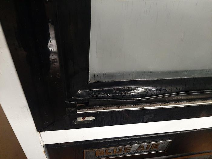 Blue Air Refrigerator, Merchandiser, Model BGM48L, interior dimensions measure 48" long x 51" high, 24" deep, 48 cubic feet capacity. Features sliding glass door, (4) shelves for each compartment. Rated for 5,800 BTU, driven by 1/2 HP, 110 Volts, 60 Hz, single phase, 3450 RPM motor. Type: Merchandiser.