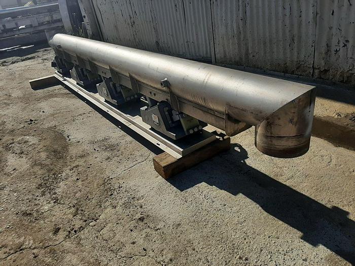 Eriez Dust-Tight Vibratory Tube Conveyor, Model 56-C, 304 stainless-steel. Tube measures 8" diameter X 10' long with 8" top inlet and bottom discharge. includes (4) Eriez HI VI drives type 56C, rated for 230 Volts, single-phase, 60 Hz, 3.3 amps. Unitized on a stainless-steel frame. Serial number 283142.