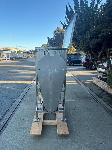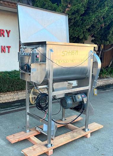 Stainless steel 15 cubic-foot double ribbon mixer, 15 CF working capacity, polished 304 stainless steel contacts, trough measures 48" long x 25" wide x 29" deep, with polished interior finish, 4mm shell thickness, includes hinged cover with backrest and safety grate. 2-1/2" solid stainless steel shaft, 38mm wide x 6mm thick outer ribbon, 38mm wide x 6mm thick inner ribbon, 46 RPM ribbon speed. Mixer is driven by 10 HP, gearhead motor thru rollerchain. Mixer has a 5" center bottom discharge, knife style pneumatic slide gate with extended discharge chute. Stainless steel frame & legs.