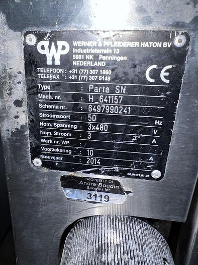 Werner & Pfleiderer Haton BV Dough Divider, Model PARTA SN - Mobile stainless steel unit with a dough hopper and a 12" x 44" sanitary conveyor. Operates on 480V, 3-phase, 60 Hz. Serial number H-641157. Manufactured in 2014.