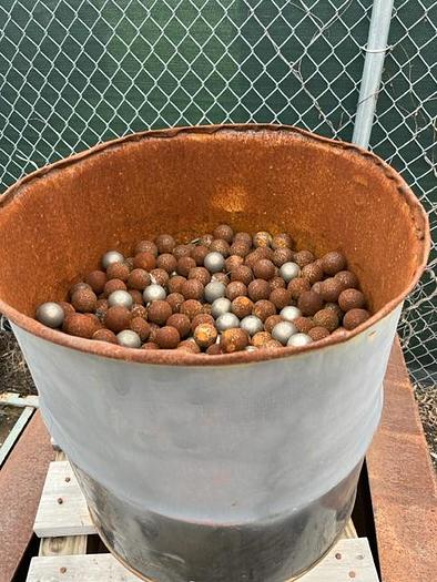 Stevenson 23" diameter X 23" long unlined steel ball mill - dry grind with dust seal rings: total volume 5.5 cubic feet Cylinder: All Fab. Steel-shell and lifter bars of hi-chrome-manganese steel (A202B Lukens) - machined on centers to insure positive alignment. Bearing: Dodge SAF-XT spherical roller bearing pillow blocks - 2 15/16 dia. gearing: direct drive- no open gears, belts, or sprockets. Drive: 5 H.P. - TEFC-230/460/3/60 HZ - right angle motor/speed reduced with gear coupling 37 RPM out. Access: one steel grinding door 23" & discharge door 23" Pedestals: fabricated steel plate and rectangular tubing with integral motor base- distance to floor 36". Venting: steel plug/brass casing mounted on door or cylinder head. Control: one control box/stop/start/timer. Discharge one steel dry discharge housing. Offered with 1-3/4 " steel balls grinding media - 1000 lbs. Unused.