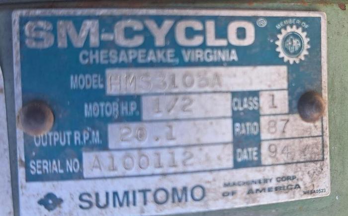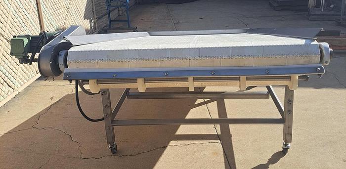Stainless Steel Incline Belt Conveyor with Intralox modular plastic food grade belt, 48" wide X 102" long, infeed height 32" leading to 52'" discharge height. Includes side rails driven by 1/2 HP, 230/460 V, 3-phase, 60 Hz, 1720 RPM motor. Gearbox ratio 87 final output 20 PRM. Mounted on stainless steel frame with casters. Manufactured by Smalley Manufacturing Company.