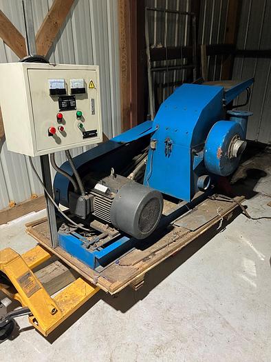 Meelko TFS 500 hammer mill grinder, manufactured in 2016 and powered by a 22 kW (30 HP), 3-phase, 220V electric motor. Unit is rated for an output capacity of 800–1000 kilograms per hour and features a heavy-duty steel frame with integrated control panel, volt/amp meters, and emergency stop. Designed for continuous grinding of agricultural products, wood chips, biomass, feed, and similar dry materials.